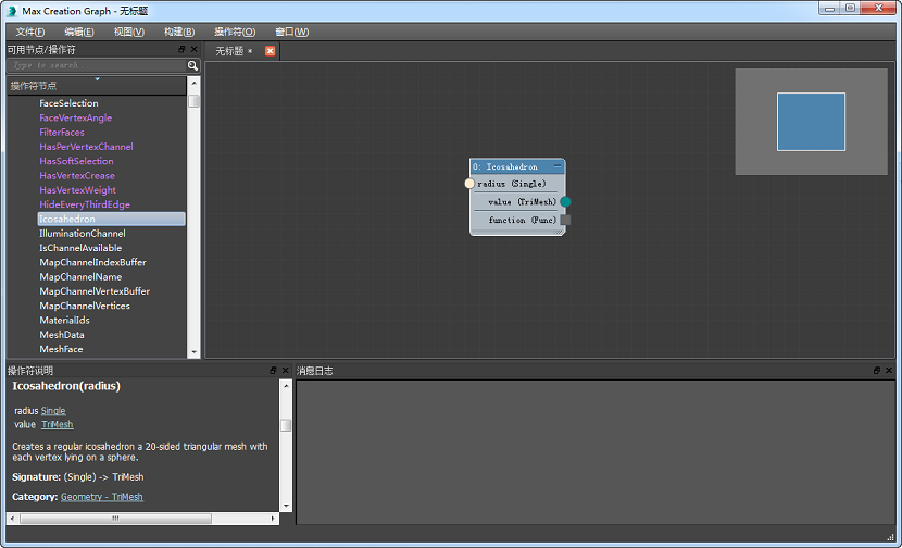 此时将打开“Max Creation Graph”编辑器对话框。它包含一个菜单栏和四个窗口:“可用节点/操作符”、“操作符说明”、“消息日志”和主图形窗口,并且当前具有标记为“无标题”的单个选项卡。