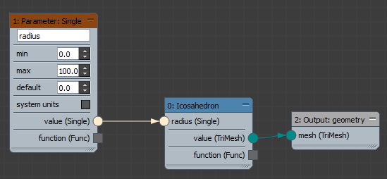 该节点包含用于创建二十面体对象的基本功能。请注意,它在左侧具有一个输入连接器,标记为“半径(单个)”,并在右侧具有一个输出连接器,标记为“值(TriMesh)”。(该过程中未使用函数连接器。)如您所见,逻辑从左至右流动。所有 MCG 图形都是这样。