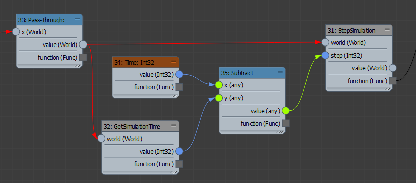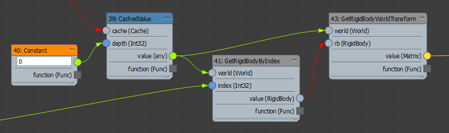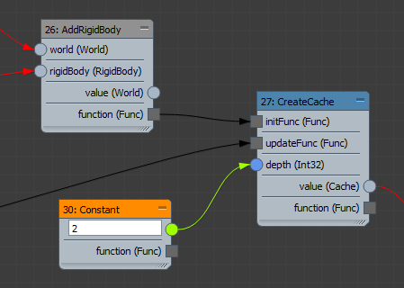 根据场景的当前时间与上次模拟时间之间的差值使模拟前进。将生成的函数连接到 CreateCache 节点的 updateFunc 端口。