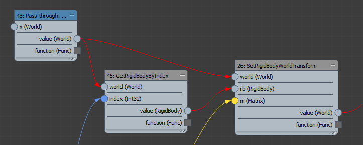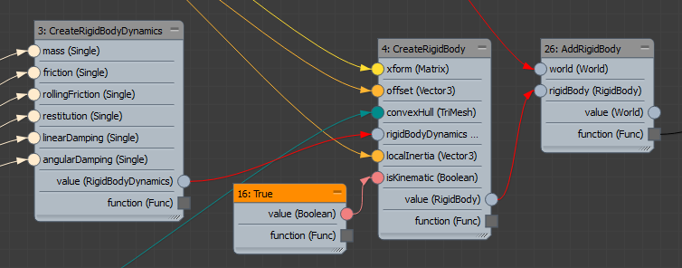 - 在其他情况下,可以有多个动力学对象。例如,可以通过在一个体积内分布变换并使用这些变换来实例化网格的多个副本,创建一个几何体。在这种情况下,您可以使用 Aggregate 操作符与变换阵列来将多个具有相同动力学属性的刚体添加到世界。