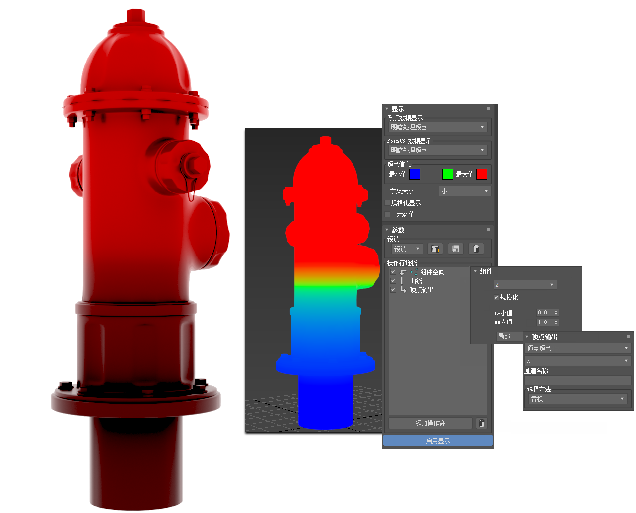 使用“组件空间”操作符根据顶点的 Z 位置为其着色,并使用“曲线”操作符来优化结果。然后,使用生成的顶点颜色数据为材质混合两种颜色。