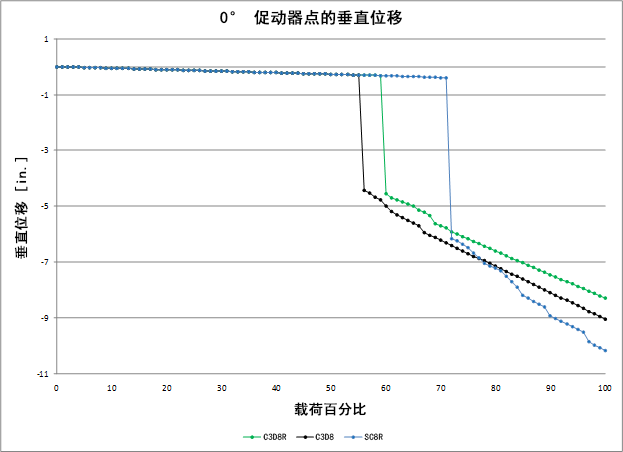 下表显示了三个模型预测每个类型的失效事件的载荷级别。下图显示了三个模型预测的合成结构的总体垂直载荷-位移曲线。