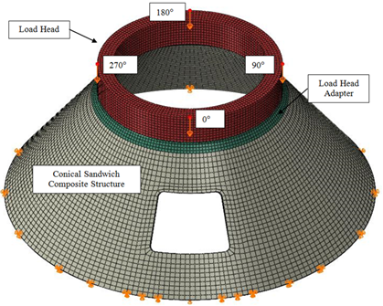 复合圆锥结构以夹层面板构造为特征。夹层面板(下方)的厚度层轮廓在圆锥上的环绕方向和轴向上都是均匀的。夹层构造的内部和外部合成面片具有 [(90/0)4] 铺层,该铺层从内表面(轴向为 0°,环绕方向为 90°)进行测量。每个复合层的厚度为 0.0075",并且由碳/环氧树脂 AS4-3501-6 组成。1" 厚型芯是各向同性泡沫材料 (Rohacell 110 WF)。