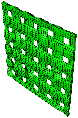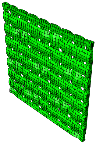 缎纹编织材料的完整单位单元 (FUC) 微观结构类似于平织模型,因为它由填充牵引、扭曲牵引和基体腔组成。FUC 还假设填充和扭曲牵引互相垂直。和平织微观结构一样,定义 FUC 微观结构也需要许多几何特性(长度、宽度、高度、间距)。