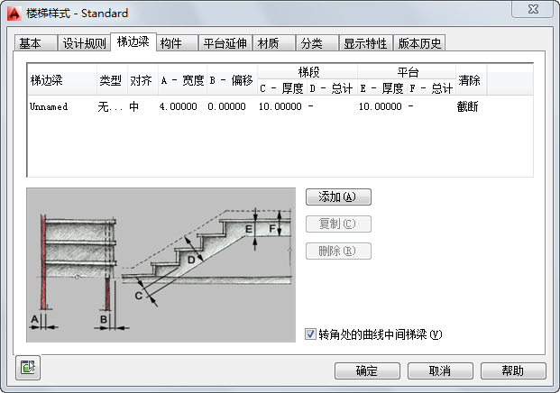 使用以下步骤可以将梯边梁包括在楼梯样式中。一个楼梯样式可以有一个或多个梯边梁。可以指定每个梯边梁的特性。如果楼梯样式使用梯边梁,则可以指定梯段和平台处的板厚,并让具有斜接或曲线角的中间梯梁位于平台转角处。对于坡道或有侧板梯边梁,也可以指定梯段和平台处的总厚度。