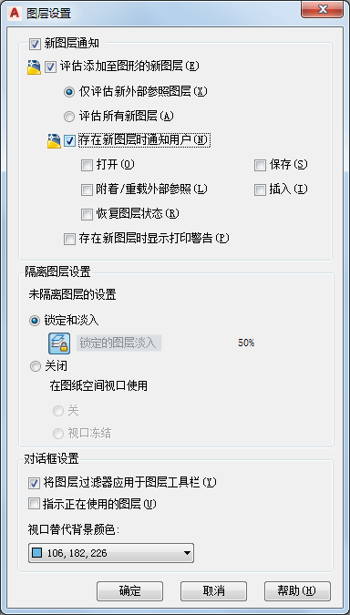 - 若要在图形中设置新图层通知,请选择“评估添加至图形的新图层”。