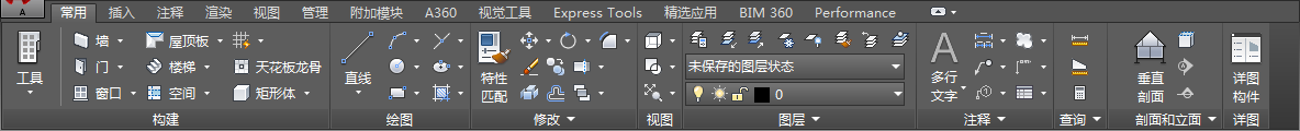 “常用”选项卡包含本软件中最常用的命令。在该选项卡中可以找到基本的对象和图形工具,以及修改工具、图层和基本符号标注等常用的实用程序。新图形使用“常用”选项卡作为起点。