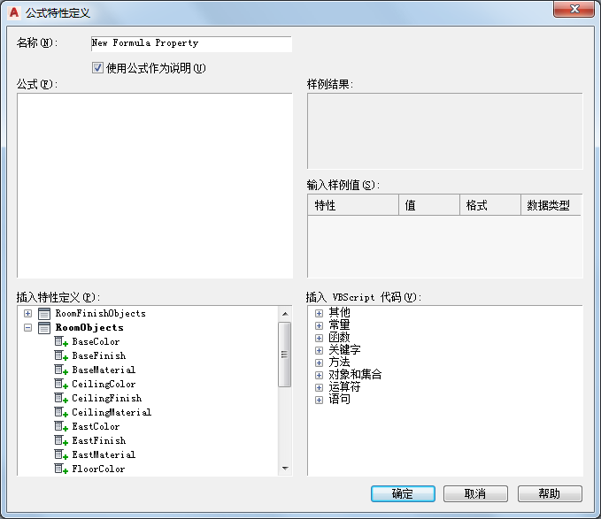 | 使用公式中其他特性定义的值 | 找到并双击“插入特性定义”列表中的定义(或单击鼠标右键,并单击“插入”)。也可以先选择定义,然后按 Enter 键。 |
