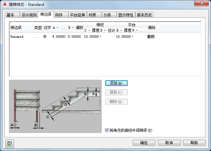 当“转角处的曲线中间梯梁”选项处于清除状态时,中间梯边梁将进行斜接,以便与平台转角的角度相匹配。在多数情况下,这将是一个直角,但任何其他角度也是可行的。