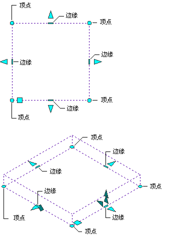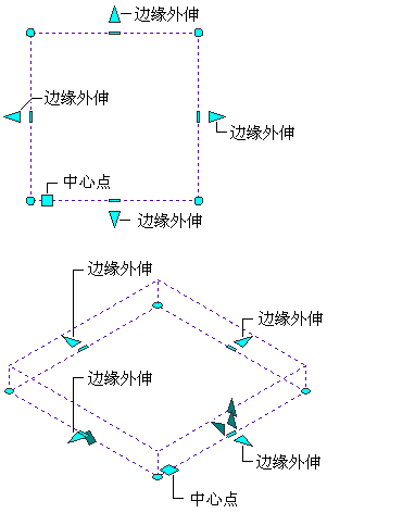 为选定楼板/屋顶板提供的编辑夹点类型取决于观察方向。如下列插图所示,“边缘”、“边缘出挑”、“顶点”和“中心点”夹点同时在平面图和三维 (3D) 等轴测视图中显示。“角度”、“垂直偏移”、“水平偏移”和“厚度”夹点只在三维等轴测视图中显示。
