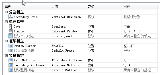创建幕墙样式的元素定义后,可以将这些定义指定给每种幕墙元素类型:分割、单元内嵌、框架和竖梃。