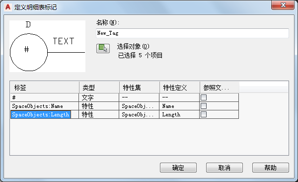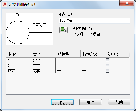 可以创建明细表标记,方法是:绘制符号并添加作为属性占位符的文字,或者分解并自定义现有的明细表标记。创建明细表标记时,会向每个属性指定一个唯一的名称(称为属性标记),该名称由关联的特性集定义和特性定义的名称组合而成。将明细表标记定位到应用特性集定义的对象时,此标记会显示属性标记标识的特性值。