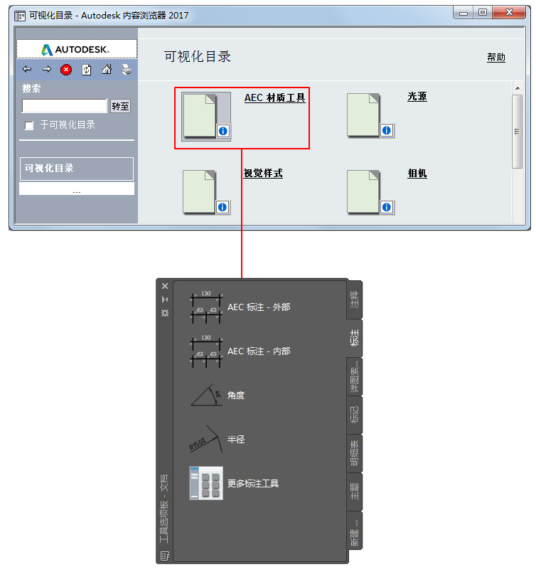 多个用户处理一个大型项目时,工具一致性非常重要。通常项目的对象、其样式和特性由 CAD 管理员或系统管理员设定,然后分发给团队。管理员可以将工具和选项板放在“内容浏览器”中的中心位置,并将它们链接到每个用户的计算机。每次在“内容浏览器”中更新工具或选项板时,也会在用户的计算机上更新它们。