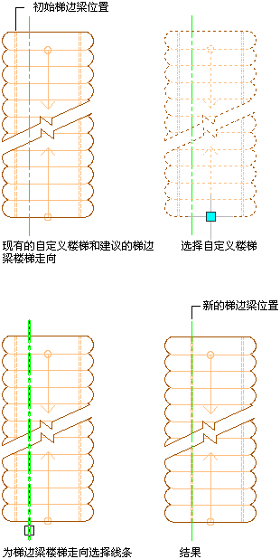 使用以下步骤,通过选择线条,可以将现有的自定义梯边梁楼梯走向替换为新的梯边梁楼梯走向。该线条必须位于楼梯内部,才能用于替换梯边梁楼梯走向,而且必须与楼梯的整个长度相吻合。