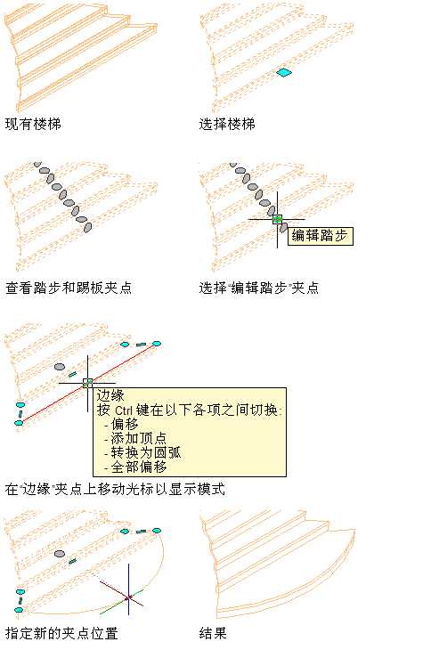 此时将在每个踏步和踢板的中点显示一个夹点。