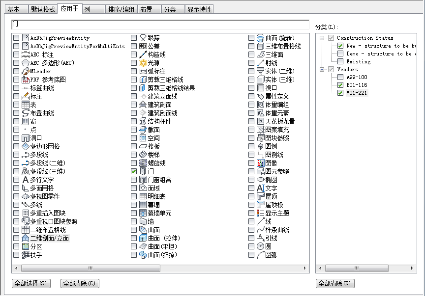 使用以下步骤可以指定分类标准,对象必须满足此标准才能包含在使用明细表样式创建的明细表中。可以为一个对象类型指定多个分类。
