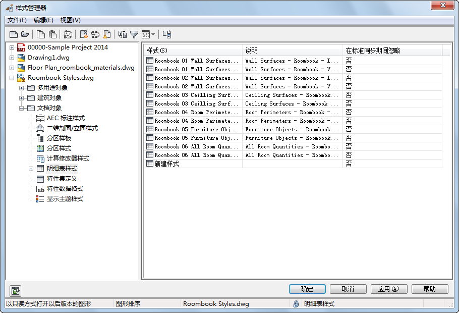 从“明细表样式”中,将预定义的 Roombook 明细表样式输入到图形中。