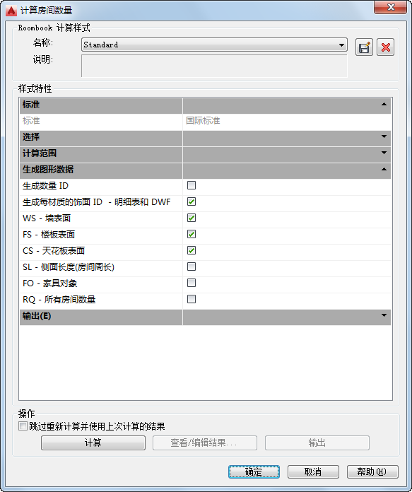 - 在“计算房间土方量”对话框中,在“样式特性”下的“生成图形数据”列表中,选择“生成每材质的完工 ID”。