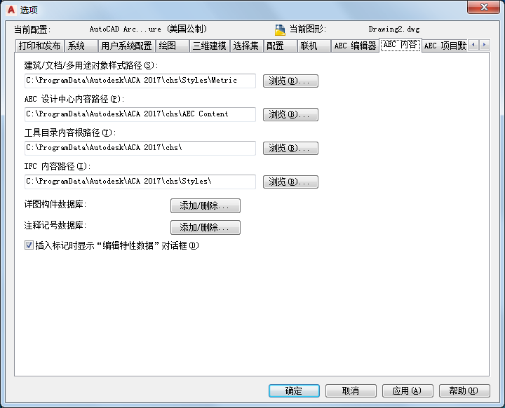 使用此过程可以为当前图形指定默认的 AEC 内容选项。