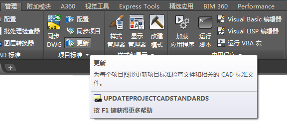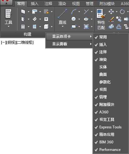 在选定的选项卡或面板名称旁边将会显示一个复选标记。
