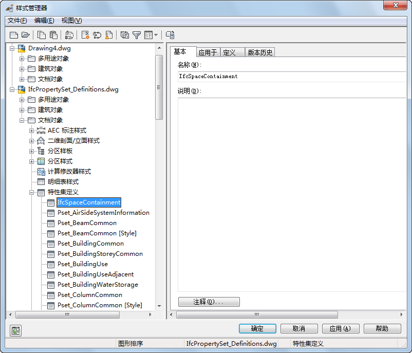 - 导航到 C:\ProgramData\Autodesk\ACA <版本>\chs\Styles 并打开 IfcPropertySet_Definitions.dwg。