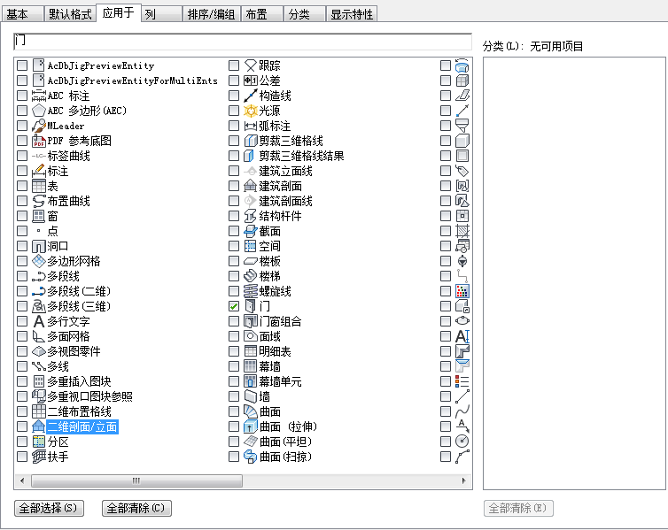 右窗格中列出了适用于所有选定对象类型的所有分类定义。可以在多个分类定义中选择多个分类。选择分类后,此样式的明细表可以包含在左侧选定的对象,前提是必须已经根据选定的分类对这些对象进行分类。