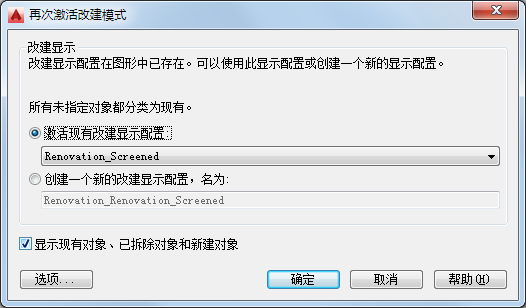 在先前激活的图形中重新激活改建模式后,可以继续使用现有的改建显示配置或创建新的显示配置。