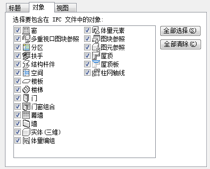 - 单击“对象”选项卡,然后选择要包括在 IFC 文件中的对象。