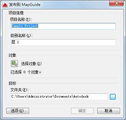 如果要从中发布对象的图形是建筑项目的一部分,则该图形的项目名称和层指定将显示在“发布到 MapGuide”对话框中。