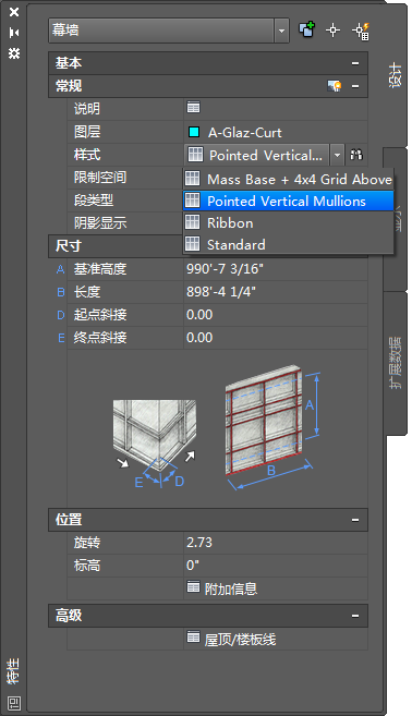 执行以下步骤可以在“特性”选项板上为幕墙选择另一样式。