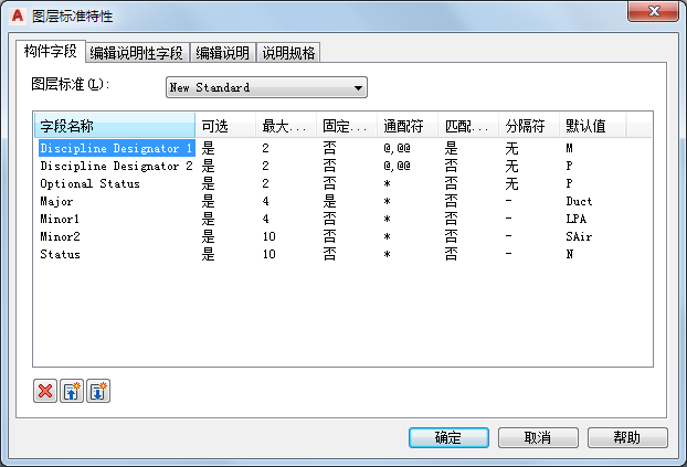 每个图层标准都定义了构成图层名称的构件字段的数目,并针对每个字段中所允许的内容指定了规则。如果创建或编辑图层标准,可以访问图层标准特性来编辑构件字段。