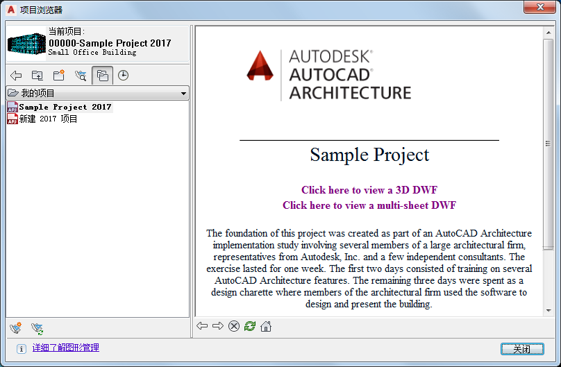 在“项目浏览器”中,可以新建项目、配置项目设置和项目标准、添加详细信息以及选择当前项目。将项目设置为当前项目时,通过关联菜单或双击文件名,可将项目移植为与当前版本的 AutoCAD Architecture 兼容的格式。如果重新指定项目路径,所有项目图形都会随之移植,您将无法在以前版本的软件中打开此项目。