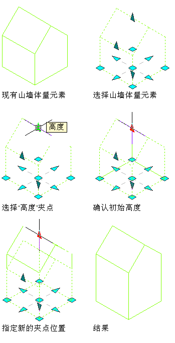 使用以下步骤可以通过夹点来修改“山墙”体量元素的屋顶高。