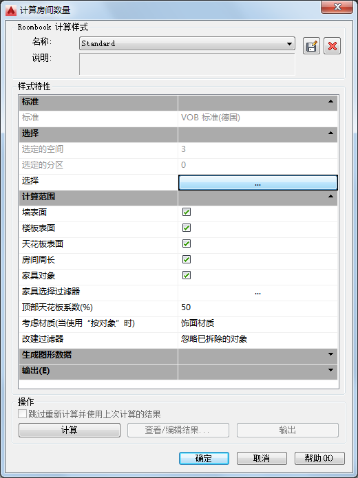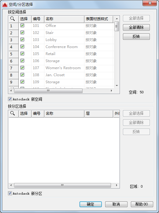 - 将列出图形的所有空间。显示应用的表面材质样式。默认情况下,将选定包含在计算中的所有空间。如果不要计算空间,请清除该复选框。