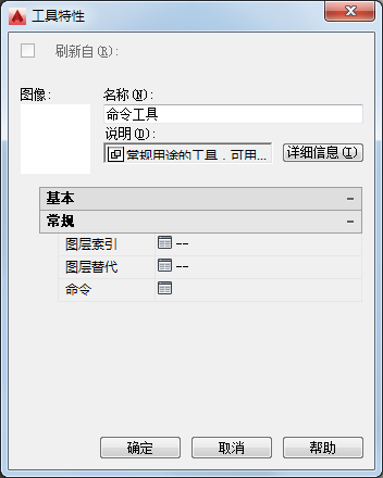 | 图像 | 默认情况下,命令工具没有关联的图像。若要添加一个图像以展示相应工具的功能,请在空白图像区域中单击鼠标右键,然后选择一个图像。 |