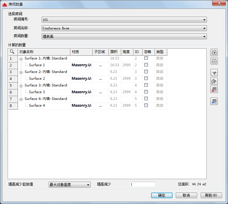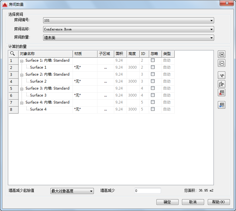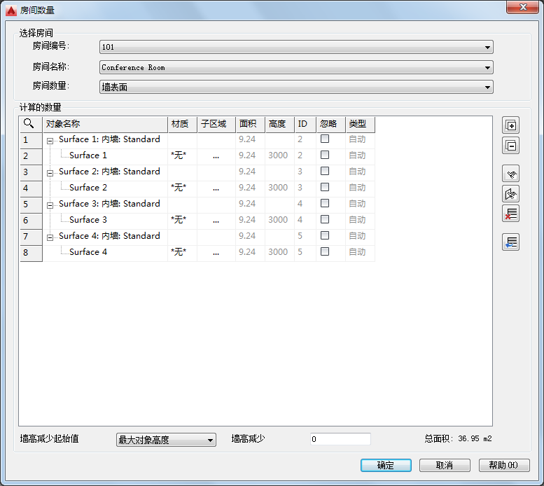将列出属于选定房间的所有墙表面。将为每个对象和面显示高度。