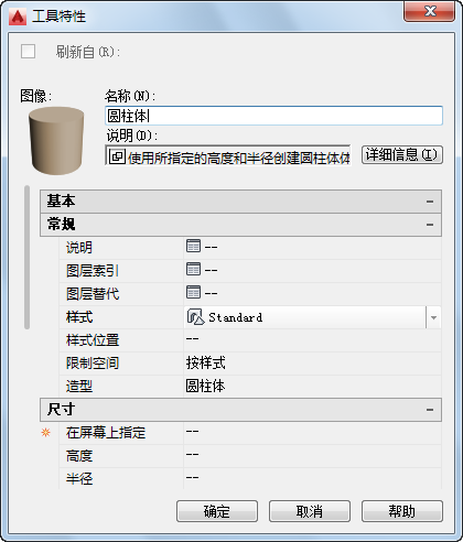 体量元素样式工具的工具特性。请注意,已对工具的名称进行了修改,修改后的名称更具有说明性。另外,由于此工具创建的体量元素要定义分类为外墙的装饰柱,因此工具的创建者决定将体量元素放置在由当前图层索引样式中的“墙”索引定义的图层上。在该示例中,体量元素造型也被预定义为圆柱体,原因是它要定义特定的对象类型,而不只是特殊的材质指定。
