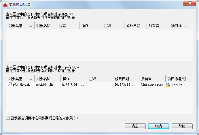 这种情况下,在将来的更新中不会再次列出非标准化的显示设置,除非您选中了“显示要在项目标准同步期间忽略的对象集”或在显示管理器中删除了显示设置对应的“忽略”标记。