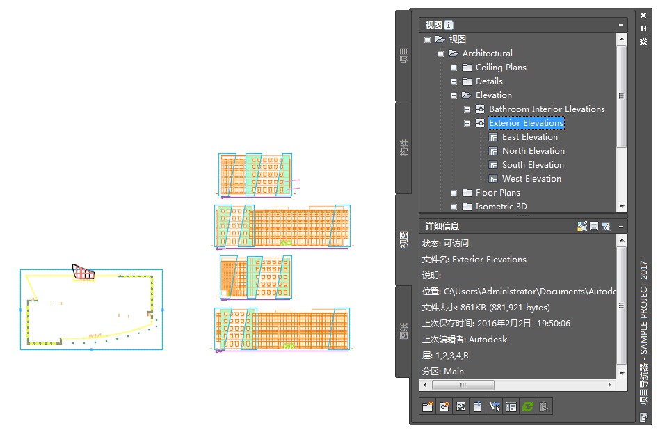 通过从“项目导航器”选项板中选择构件,并将其参照到视图图形中,可以创建视图图形。如果创建多层视图,则每个构件都以其相对层高参照,最低层插入到 Z = 0 处。