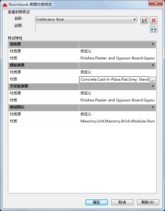- 在“Roombook 表面材质样式”对话框中,创建或编辑现有表面材质样式或从目录加载表面材质样式。