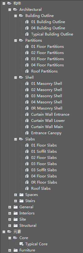 图形管理器是“项目导航器”的“构件”、“视图”和“图纸”公用的树视图。也可以在此组织图形文件。“项目导航器”的每个选项卡(除“项目”选项卡之外)都具有显示关联项目图形文件(元素、构件、视图和图纸)的树状图。