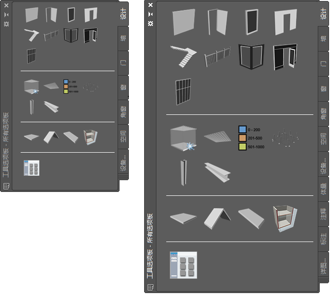 如果将工具图像修改为较小尺寸,则可以在工具选项板上显示更多的工具。如果同时还要显示其他选项板(例如“特性”选项板或“项目导航器”选项板),这可能成为一项重要功能。