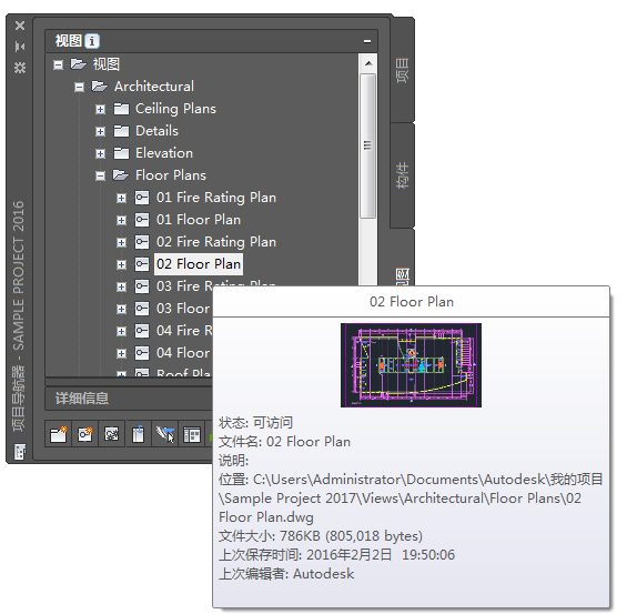 | 在“项目导航器”选项板底部显示“预览”或“详图”窗格 | 选择“预览/详细信息窗格”。 |