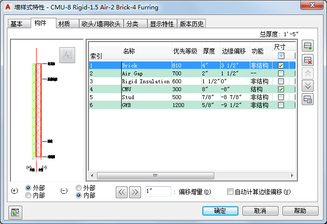 应当在名称中提供尽可能多的关于墙结构的信息。这样无需参照墙样式的说明,即可轻易区别长列表中的各个墙样式。列出的第一个构件是主结构构件。列出的最后一个构件是完工构件。
