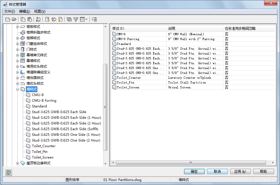 样式分为 3 种类别:建筑对象(如门样式)、文档对象(如明细表样式)以及多用途对象(如图层索引样式)。在每一类别中,样式按照字母顺序排列。若要过滤树状视图,以便仅显示一种样式类型的样式,请选择所需的样式类型,然后在样式管理器工具栏上单击