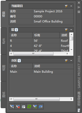 “项目导航器”选项板是创建、修改和访问 AutoCAD Architecture 项目文件的中心位置。在处理项目时,通常会在工作空间中打开“项目导航器”选项板。