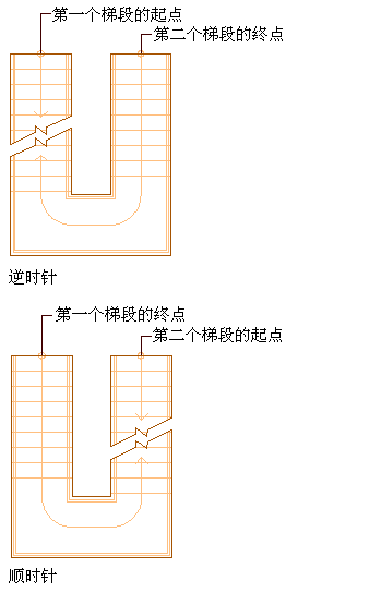 | 所绘制 U 形楼梯的右侧成为楼梯外侧边缘,而左侧成为内侧边缘 | 在“水平方向”中选择“逆时针”。 |