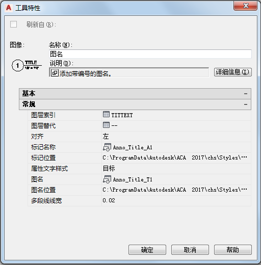| 名称 | 常规 | 为该工具创建的模型空间视图设置一个默认名称。可在图形中插入详图索引期间替代在工具中设置的名称。 |