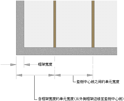 默认情况下,格线单元从门窗组合基线的起点到终点进行测量(对于水平分割),或从基线到基准高度进行测量(对于垂直分割)。计算单元尺寸时,不会将格线框架的宽度计算在内。例如,如果在左侧和右侧绘制了一个基线为 14 英尺、框架为 1 英尺的门窗组合,并且指定了固定数量的垂直单元,那么,这些单元的尺寸将显示不一致。第一个单元与最后一个单元会显得小些,因为它们包含框架。