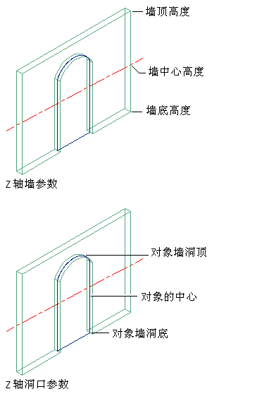 | 使用墙高的中心作为参照点 | 在“垂直于 Z 轴定位”下,在“自”中选择“墙中心高度”。 |
